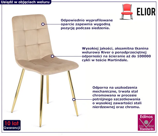 • francuski welur: tapicerka krzesła to wysokiej jakości, aksamitna tkanina welurowa River należącą do francuskich welwetów, która charakteryzuje się wyjątkową odpornością na ścieranie, co potwierdza do 100000 cykli w teście Martindale