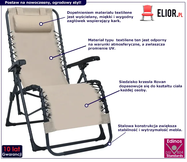 - Wymiary: szerokość – 65 cm, głębokość – 50 cm, wysokość – 111 cm - Z wyściełanym zagłówkiem - Produkt składany i odporny na warunki atmosferyczne - Materiał: oddychająca tkanina typu textilene, wysokogatunkowa stal nierdzewna AISI 430. - Kolor: kremowy. Kliknij w link sprawdź także inne meble ogrodowew sklepie Edinos.pl. Stwórz swój praktyczny zestaw mebli. - Marka: Edinos Premium. - Produkt posiada certyfikat jakości "Edinos Standards DSI 804", który potwierdza najwyższą jakość wykonania mebla oraz pełny stopień zgodności poszczególnych jednostek wytworzonego wyrobu z przyjętym wzorcem. - Bardzo łatwy montaż (w zestawie znajduje się czytelna i dokładna instrukcja montażu mebla). - Gwar. 10 lat (inni producenci oferują maksymalnie 24 miesiące gwar. Tylko u nas otrzymujesz pełną jakość potwierdzoną aż 10-letnią gwar.)!