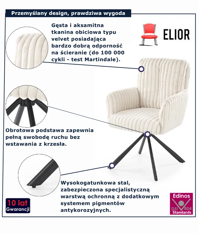 • Produkt posiada certyfikat jakości "Edinos Standards DSI 804", który potwierdza najwyższą jakość wykonania mebla oraz pełny stopień zgodności poszczególnych jednostek wytworzonego wyrobu z przyjętym wzorcem.