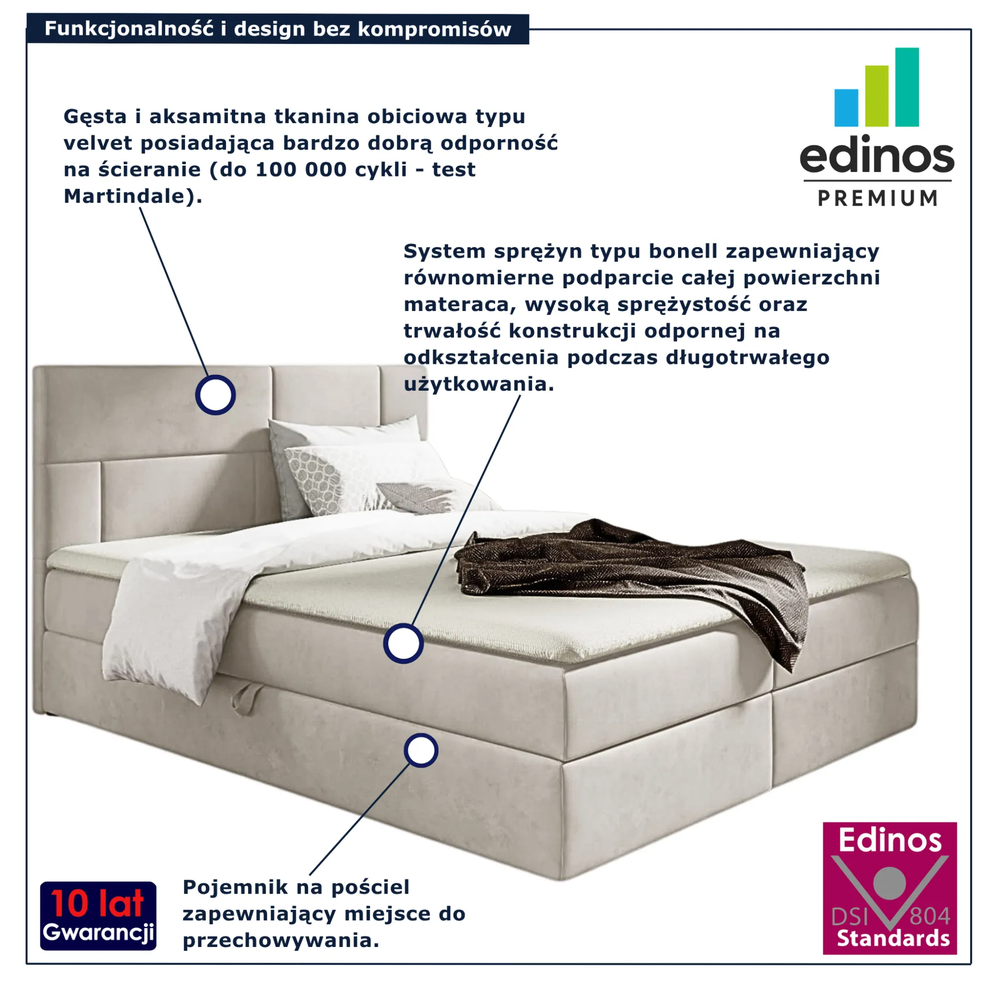• Produkt posiada certyfikat jakości "Edinos Standards DSI 804", który potwierdza najwyższą jakość wykonania mebla oraz pełny stopień zgodności poszczególnych jednostek wytworzonego wyrobu z przyjętym wzorcem.