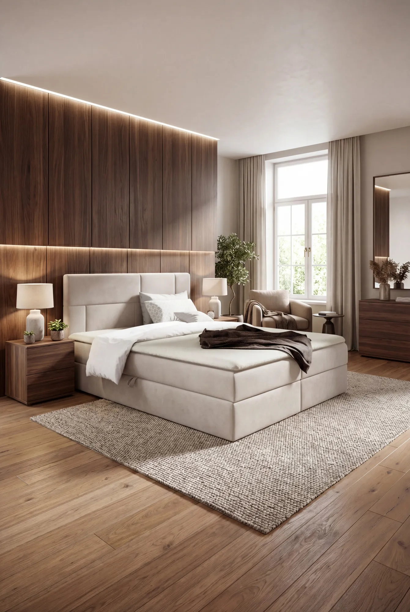 Aranżacja sypialni z kremowym łóżkiem kontynentalnym Orellis