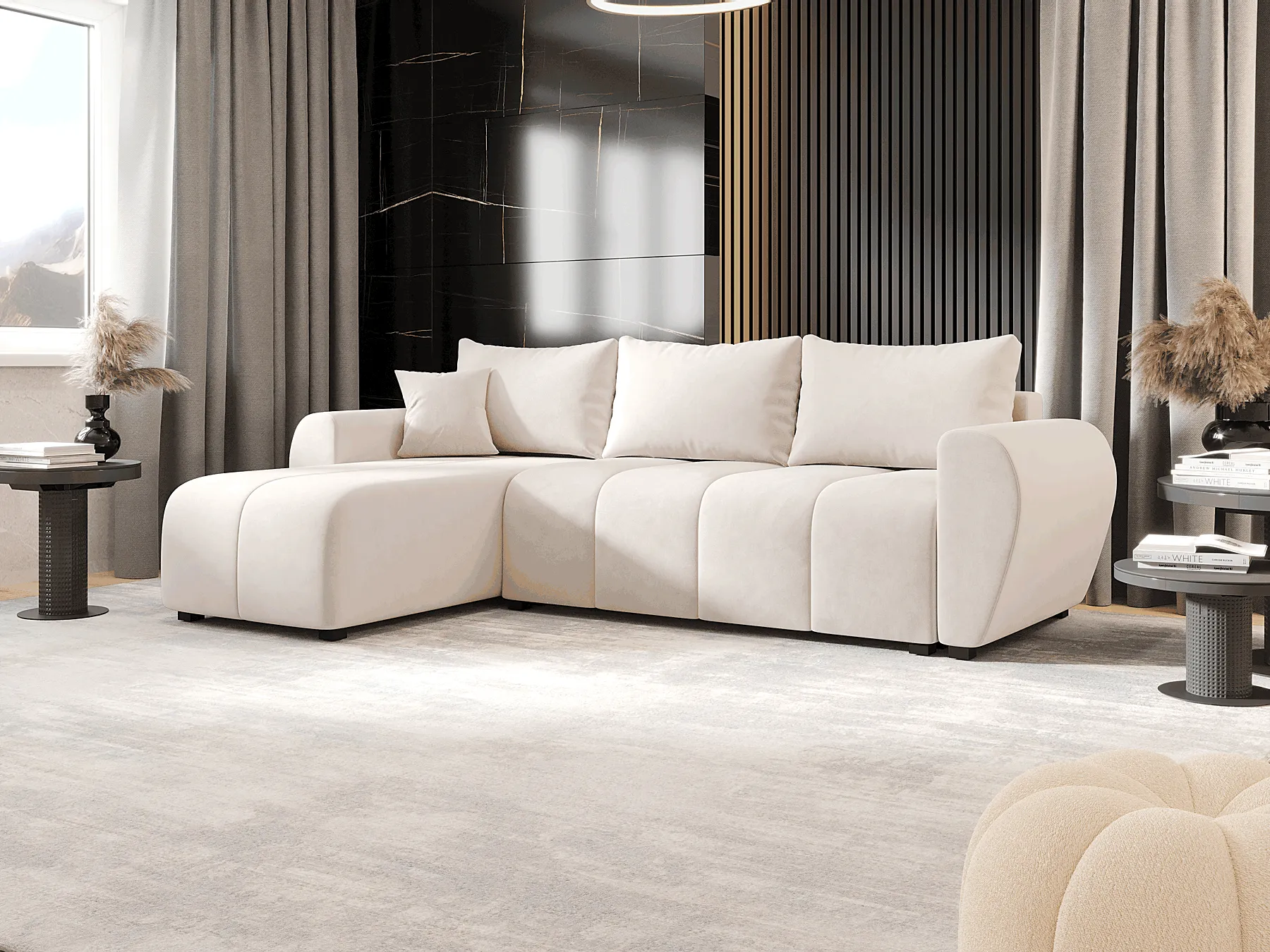 Wizualizacja wnętrza z kremowym narożnikiem Velmores 4X