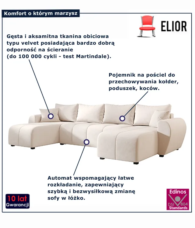 • Produkt posiada certyfikat jakości "Edinos Standards DSI 804", który potwierdza najwyższą jakość wykonania mebla oraz pełny stopień zgodności poszczególnych jednostek wytworzonego wyrobu z przyjętym wzorcem.