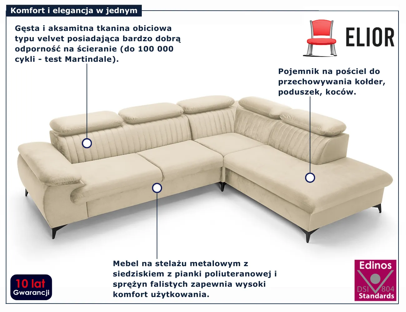 Kremowy narożnik welurowy z funkcją spania Revioni 3X
