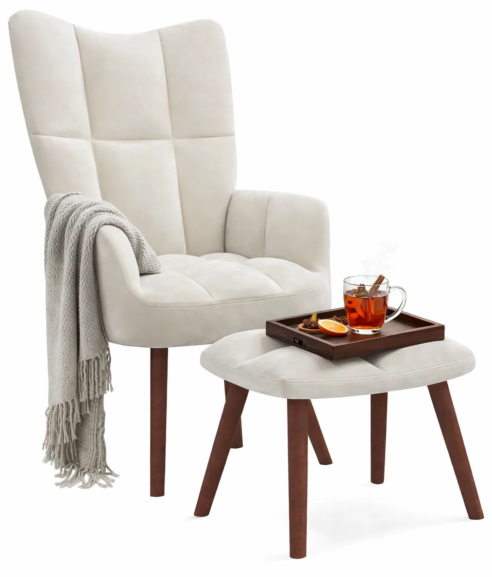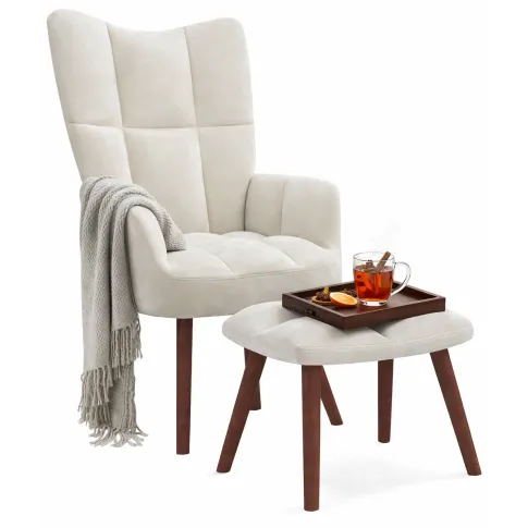 Bardzo ładny fotel - kremowy kolor i nowoczesny design sprawiają, że ładnie wygląda w salonie lub pokoju. Tapicerka jest przyjemna w dotyku i wydaje się łatwa do utrzymania w czystości, a dodatkowy podnóżek to fajny dodatek, który podnosi komfort użytkowania i dobrze dopełnia całość.