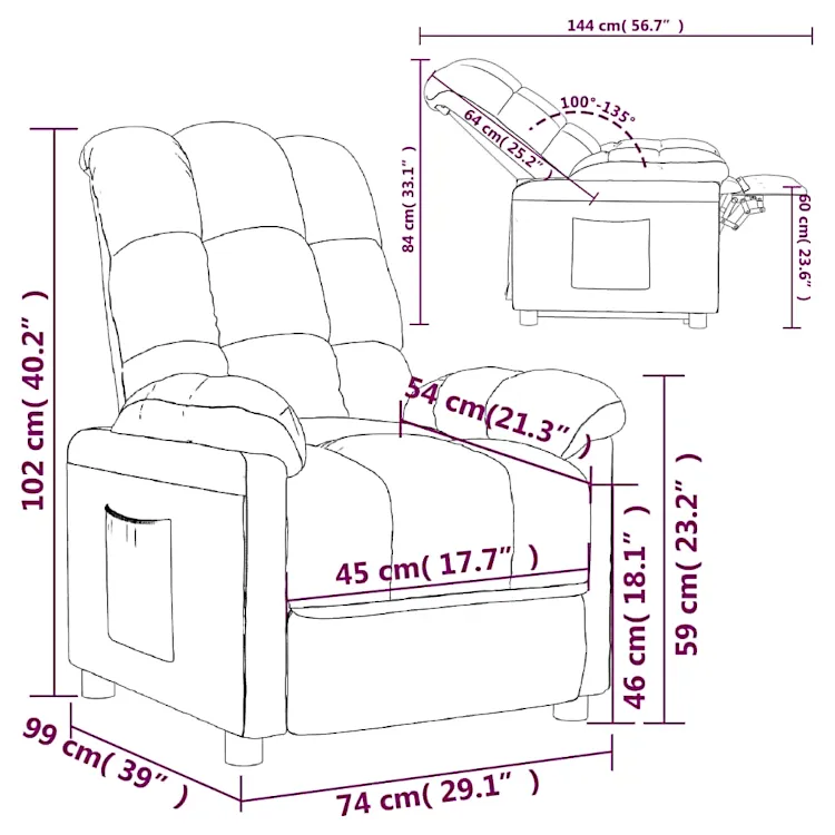 • Wymiary całkowite fotela: szerokość: 74 cm, głębokość: 99 cm, wysokość: 102 cm.
