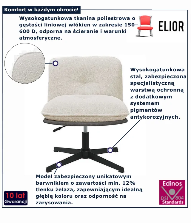 Teraz możesz mieć to wszystko w jednym - styl, wygodę i funkcjonalność. Nie odkładaj decyzji na później - Twój kręgosłup i poczucie estetyki już teraz zasługują na fotel obrotowy Zing marki Elior. Wybierz swój egzemplarz już od 838 zł i poczuj różnicę od pierwszego siedzenia! To inwestycja w lepszą wersję Twojego dnia pracy. Zacznij cieszyć się prawdziwym komfortem już dziś!