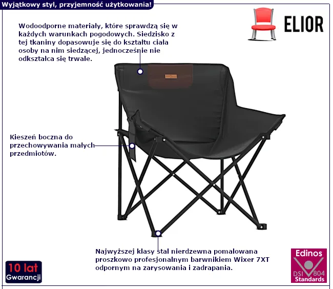 Zestaw dwóch krzeseł turystycznych Uniz marki Edinos Premium to idealne rozwiązanie dla miłośników kempingów, pikników i wypadów na świeże powietrze. Wykonane w eleganckim czarnym kolorze, krzesła te łączą w sobie styl i funkcjonalność. Dzięki wodoodpornym materiałom, Uniz sprawdzą się w każdych warunkach pogodowych, zapewniając komfort i trwałość na długie lata. Praktyczna boczna kieszeń umożliwia przechowywanie drobnych przedmiotów, takich jak telefon, książka czy napoje, zawsze w zasięgu ręki.