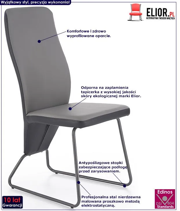 Oryginalne zaprojektowane krzesło Frenne wyróżnia się nie tylko swoją unikalną formą, ale także zastosowaniem materiałów najlepszej jakości. Designerska tapicerka w kolorze jasnopopielatym pokryta została najwyższej jakości ekoskórą (skórą ekologiczną), łatwą do utrzymania w czystości (co jest szczególnie istotne w przypadku produktów wykorzystywanych podczas spożywania posiłków). Ekoskóra używana przy produkcji mebli marki Profeos jest o wiele bardziej odporna na słońce oraz substancje płynne , co pozwala Ci na długie i bezpieczne użytkowanie. Rozlana kawa nie spowoduje już więcej konieczności wymiany tapicerki. Skóra ekologiczna marki Profeos została pokryta warstwą polichlorku winylu. Tylna strona krzesła Frenne wykonana jest ze skóry ekologicznej w kolorze ciemnopopielatym. Popielaty profil krzesła wyprodukowano z najwyższej jakości nierdzewnej stali malowanej odpornym na zarysowania i zadrapania. Najwyższa jakość techniki polimeryzacji pozwoliła zaoferować firmie Elior aż 10 lat gwarancji na swoje produkty. Już nie musisz się martwić, że po kilku latach część farby odpryśnie od mebla . Najmodniejsze połączenie kolorystyczne oraz wyjątkowa, współczesna forma sprawiają, że krzesło doskonale odnajduje się we wnętrzach mieszkalnych i komercyjnych urządzonych zarówno w stylu nowoczesnym, jak też loftowym, industrialnym czy minimalistycznym. Krzesło marki Elior zapewnia Ci niezapomniane chwile przy stole w gronie przyjaciół i rodziny. Sprawdź, jak niesamowicie mebel prezentuje się na żywo!