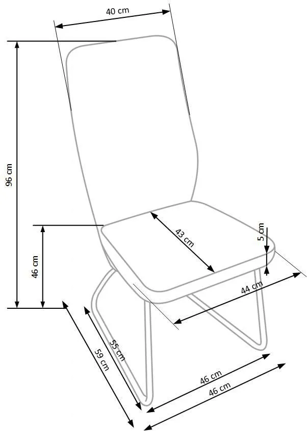 - Wymiary: szerokość mebla: 45 cm, szerokość siedziska: 44 cm, głębokość mebla: 57 cm, głębokość siedziska: 43 cm, wysokość siedziska: 46 cm, wysokość całkowita: 96 cm.