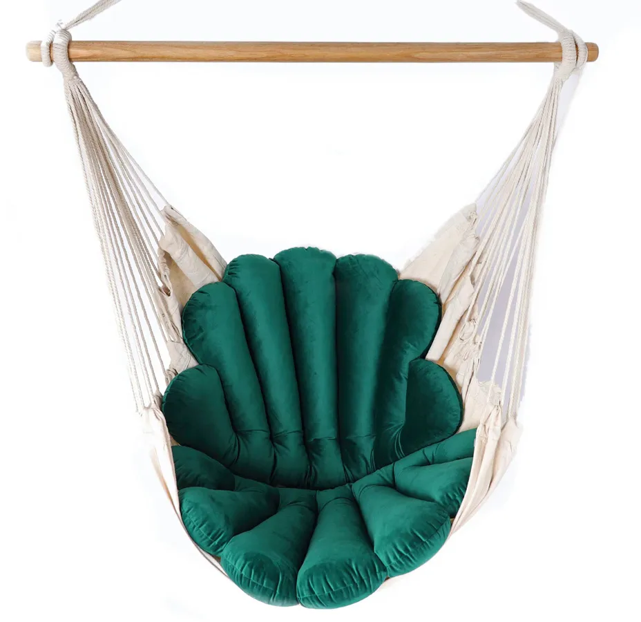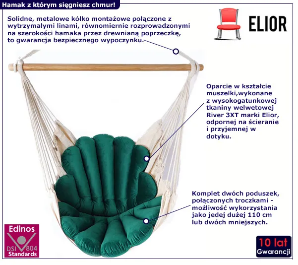 Marka Edinos Premium troszczy się o jakość swoich produktów, dlatego nasze huśtawki to prawdziwe meblowe perełki zrobione z najwyższej klasy surowców. Krzesło brazylijskie Dada to ekologiczny produkt, wykonany z wysokogatunkowego drewna - twardego, wytrzymałego i odpornego na zmienne warunki atmosferyczne. Huśtawka Dada zawieszona jest na grubych bawełnianych linach, które zapewnią bezpieczny odpoczynek. Poduszka w kształcie muszelki została obszyta wysokiej klasy, przyjemnym w dotyku materiałem welwetowym River 3XT marki Edinos Premium z antyalergicznym wypełnieniem. Tkanina jest lekka, odporna na uszkodzenia i nieziemsko delikatna, a co więcej idealnie sprawdzi się zarówno w prezentowanym hamaku, jak również w huśtawkach typu bocianie gniazdo, meblach ogrodowych lub jako poduszka dekoracyjna w salonie. Czy można chcieć więcej?