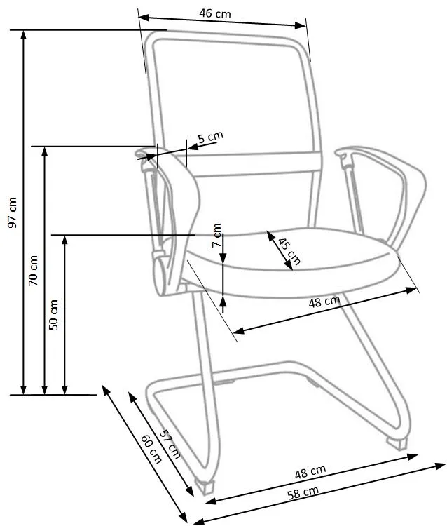 - Wymiary: szerokość siedziska: 58 cm, głębokość siedziska: 60 cm, wysokość krzesła: 97 cm.