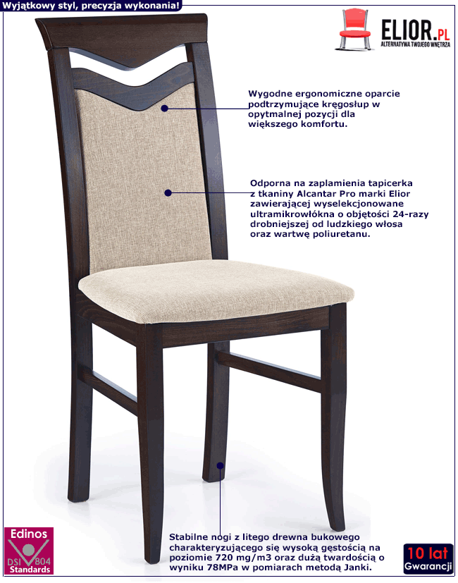 - Materiał: Naturalne lite drewno bukowe w kolorze Wenge oraz wysokiej jakości tkanina Alcantar Pro. Szukasz innych krzeseł w nowoczesnym stylu? Kliknij w link i sprawdź