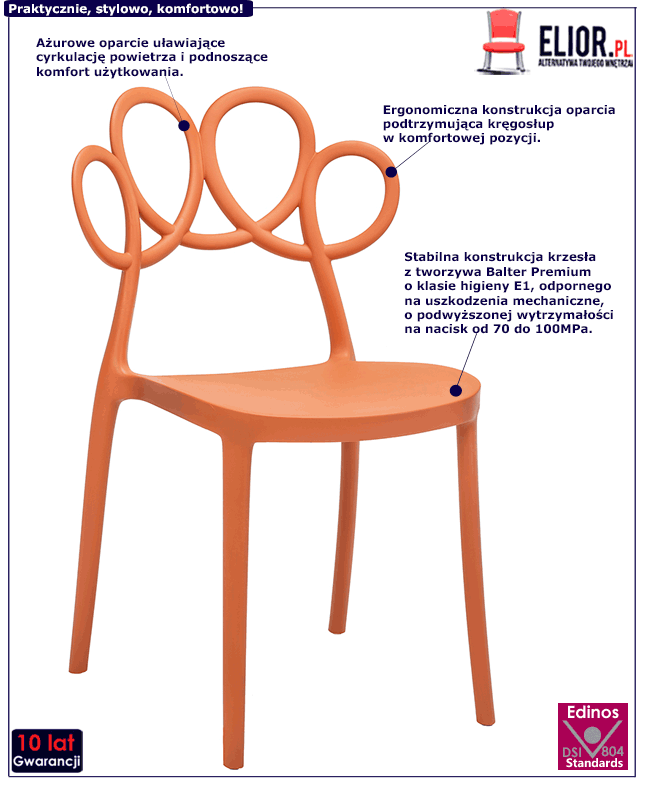 Designerskie krzesło Doreno wyróżnia się nie tylko swoją awangardową, nowoczesną formą, ale także zastosowaniem materiałów najlepszej jakości. To wyjątkowy mebel zaprojektowany i wyprodukowany zgodnie z najwyższymi standardami jakości i bezpieczeństwa. Do produkcji krzesła wykorzystano poddany specjalistycznej obróbce, nowoczesny i bezpieczny surowiec o podwyższonej wytrzymałości na nacisk od 70 do 100 MPa. Jest to wysokogatunkowe, profesjonalne tworzywo polipropylenowe Balter Premium o klasie higieny E1, cechujące się odpornością na zarysowania, zaplamienia i uszkodzenia mechaniczne. Meble wykonane z tworzywa Balter Premium charakteryzują się wysokim stopniem bezpieczeństwa, dzięki czemu stanowią idealne wyposażenie pokoi jadalnych, salonów, oraz wnętrz kawiarni i restauracji. Ponadto ten innowacyjny surowiec zapewnia wyjątkową trwałość i łatwość do utrzymania w czystości. Krzesło Doreno możesz czyścić na mokro, co jest niezwykle praktyczne w przypadku mebli przeznaczonych do jadalni, restauracji czy na tarasy. Dodatkowym atutem krzesła Doreno jest jego kolor w modnym matowym wykończeniu, nie ulegający wybarwieniom pod wpływem światła. Istotną i wyjątkowo praktyczną cechą krzesła jest możliwość sztaplowania, czyli wkładania jedne w drugie, co jest niezwykle praktyczne w przypadku niewielkich pomieszczeń. Możesz mieć cały zestaw kolorowych krzeseł Doreno i nie martwić się brakiem miejsca. Kiedy nie będą potrzebne, łatwo możesz je przechować składając w słupek. Perfekcyjnie wyprofilowane oparcie, stabilne i dobrze wyważone nogi tworzą wyjątkowo komfortowe krzesło, stworzone do długich biesiad przy stole. Radosne chwile w rodzinnym gronie, herbatka na tarasie, urodzinowe przyjęcie Twojej pociechy - te niezapomniane i radosne chwile uprzyjemnią fantastyczne krzesła Doreno marki Elior.