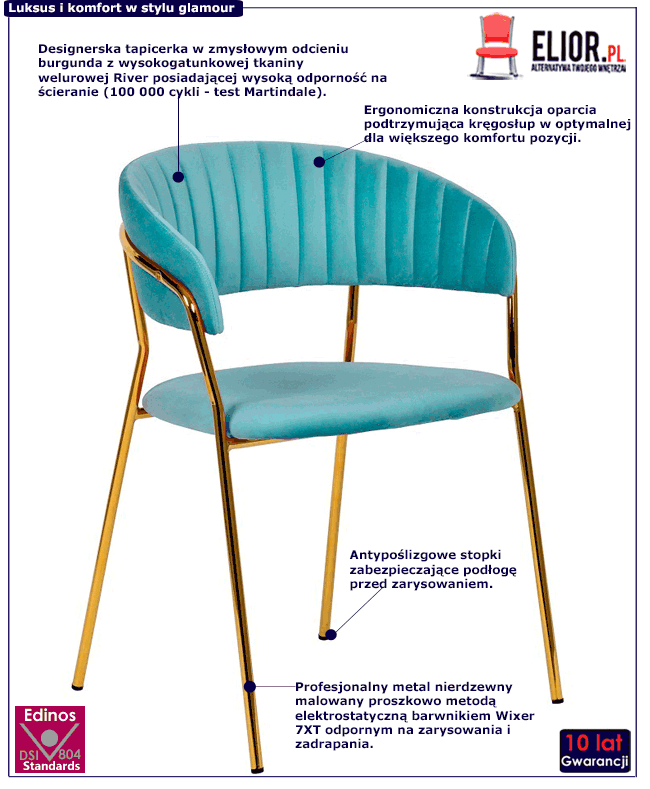Luksusowe krzesło Milwa wyróżnia się nie tylko swoją unikalną, nowoczesną formą, ale także zastosowaniem materiałów najlepszej jakości. Perfekcyjnie wyprofilowane oparcie i komfortowe siedzisko oraz wyrafinowany design to charakterystyczne cechy tego wyjątkowego krzesła. Designerska tapicerka wykonana została z wysokogatunkowej tkaniny River - to gęsta i aksamitna tkanina obiciowa typu velvet. Materiał ten jest niesamowicie miękki i aksamitny w dotyku, a nasycony i zmysłowy odcień szlachetnego turkusu dodaje całości szyku i subtelnej elegancji. River to jeden z francuskich welurów posiadający bardzo dobrą odporność na ścieranie (do 100 000 cykli - test Martindale). Już nie musisz się martwić, że rozlana kawa spowoduje konieczność wymiany mebla. Profil i nóżki krzesła stworzony jest z najwyższej jakości profesjonalnego metalu nierdzewnego malowanego techniką proszkową, charakteryzującą się dużą trwałością, odpornością na korozję, chemikalia, wysoką temperaturę oraz uszkodzenia mechaniczne. Najwyższa jakość techniki metody natrysku proszkowego pozwoliła zaoferować firmie Elior aż 10 lat gwar. na swoje produkty. Zapomnisz o stresie, że po kilku latach część farby odpryśnie od mebla . Zastosowanie tych odpornych na uszkodzenia materiałów znacząco wydłuża czas eksploatacji mebla, co pozwoli Ci cieszyć się jego wygodą przez długie lata. Daj się uwieść czarowi krzesła Milwa, że i bliscy zechcecie spoczywać na nich jak najdłużej celebrując wspólne chwile.