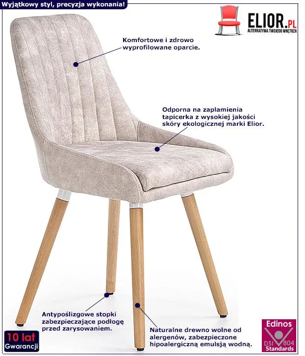 Oryginalne i komfortowe krzesło Rendez wyróżnia się nie tylko swoją unikalną formą, ale także zastosowaniem materiałów najlepszej jakości. Designerska tapicerka mebla w kolorze beżowym pokryta została najwyższej jakości ekoskórą (skórą ekologiczną), łatwą do utrzymania w czystości (co jest szczególnie istotne w przypadku produktów wykorzystywanych podczas spożywania posiłków). Ekoskóra używana przy produkcji mebli marki Elior jest o wiele bardziej odporna na słońce oraz substancje płynne , co pozwala Ci na długie i bezpieczne użytkowanie. Już nie musisz się martwić, że rozlana kawa spowoduje konieczność wymiany mebla. Skóra ekologiczna została pokryta warstwą polichlorku winylu. Profil mebla stworzony został z naturalnego drewna wolnego od alergenów, a następnie zabezpieczonego hipoalergiczną emulsją wodną. Stonowana kolorystyka i prosta forma sprawiają, że krzesło doskonale odnajduje się we wnętrzach urządzonych w stylu skandynawskim, jak też minimalistycznym czy nowoczesnym. Rendez z powodzeniem sprawdza się także jako wygodny fotel do biurka. Krzesło marki Elior zapewnia Ci niezapomniane chwile przy stole w gronie przyjaciół i rodziny. Wnieś do swojego wnętrza nastrojowy klimat, harmonizując go z ciepłem naturalnych barw!