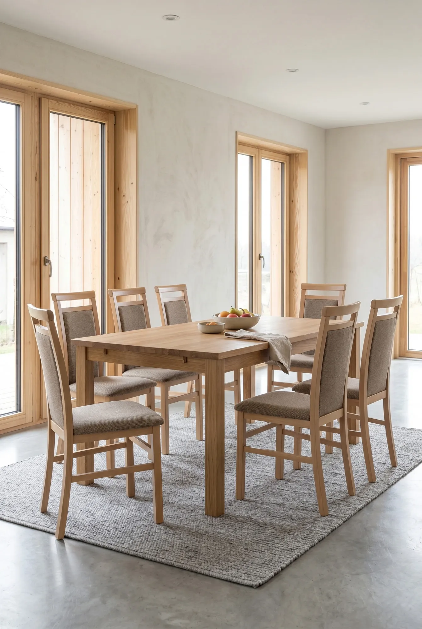 Aranżacja jadalni z krzesłami drewnianymi dąb artisan + jasny brąz Kensa 5X