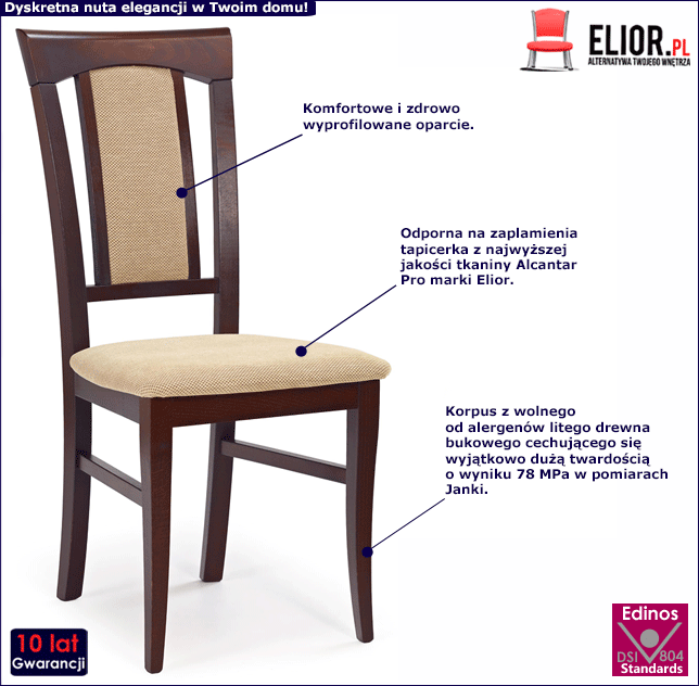 Wykwintne i komfortowe krzesło Ulevis to najnowsze dzieło uzdolnionych projektantów marki Elior. Unikatowa forma i najwyższej jakości materiały to cechy wyróżniające prezentowane krzesło. Korpus krzesła to szlachetne drewno bukowe charakteryzujące się wysoką gęstością na poziomie do 720 mg/m3 oraz wyjątkowo dużą twardością o wyniku do 78 MPa w pomiarach Janki. To naturalne drewno wolne od alergenów i dodatkowo zabezpieczone hipoalergiczną emulsją wodną. Drewno bukowe to idealny surowiec do wyrobu mebli. Buk to klasa sama w sobie. Jest piękny, unikatowy i w 100% ekologiczny. Na uwagę zasługuje również tapicerka mebla, która wykonana została z najwyższej jakości tkaniny Alcatar Pro marki Elior. Materiał jest trwały, łatwo się czyści i elegancko prezentuje. Dodatkowo cechuje się dużą odpornością na ścieranie i zabrudzenia oraz niezwykłą miękkością w dotyku (dzięki warstwie poliuretanu). Tkanina Alcantar Pro, która jako jedyna na rynku produkowana jest z dokładnie wyselekcjonowanych ultramikrowłókien o objętości aż do 24-razy drobniejszej od ludzkiego włosa, charakteryzuje się wyjątkową żywotnością, odpornością oraz niezwykłą łatwością w utrzymaniu. Posiada ponadprzeciętne cechy wytrzymałościowe, dzięki czemu unikniesz co sezonowej wymiany tapicerki. Tkanina Alcantar jest bardzo praktyczna, można ją czyścić na mokro, co jest niezwykle istotne w przypadku mebli wykorzystywanych podczas posiłków. Atrakcyjność prezentowanego krzesła Ulevis potęguje fakt, że w tej samej propozycji cenowej istnieje możliwość wyboru koloru korpusu mebla. Do dyspozycji masz: biały, ciemny orzech, czereśnię antyczną, dąb miodowy i dąb sonoma. Czy już wiesz, który kolor będzie pasował do Twojego wnętrza? Z pewnością tak. Otwórz się na piękno i zaproś do swojego salonu, kuchni czy jadalni wyjątkowy produkt w stylowym wydaniu.
