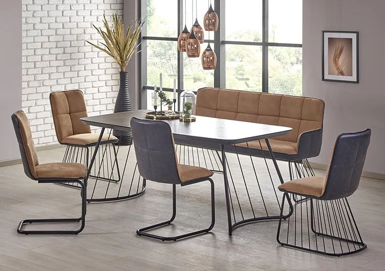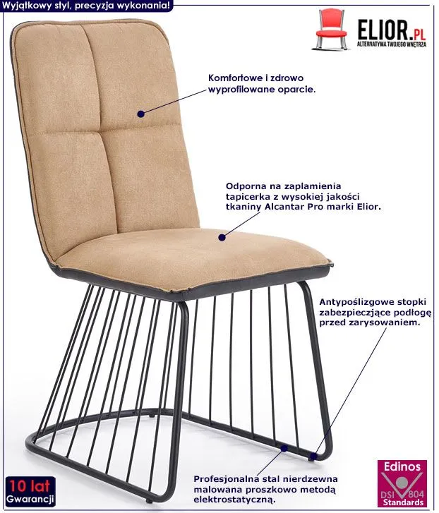 Oryginalne zaprojektowane krzesło Enix 3X wyróżnia się nie tylko swoją unikalną formą, ale także zastosowaniem materiałów najlepszej jakości. Designerska tapicerka w kolorze beżowym wykonana została z wysokiej jakości tkaniny Alcantar Pro, charakteryzującej się dużą odpornością na ścieranie i zabrudzenie oraz niezwykłą miękkością w dotyku (dzięki warstwie poliuretanu). Tkanina Alcantar Pro, która jako jedyna na rynku produkowana jest z dokładnie wyselekcjonowanych ultramikrowłókien o objętości aż do 24-razy drobniejszej od ludzkiego włosa,charakteryzuje się wyjątkową żywotnością, odpornością oraz niezwykłą łatwością w utrzymaniu. Posiada ponadprzeciętne cechy wytrzymałościowe, dzięki czemu unikniesz co sezonowej wymiany tapicerki. Tkanina Alcantar jest także bardzo praktyczna i można ją czyścić na mokro, co jest niezwykle istotne w przypadku mebli wykorzystywanych podczas posiłków. Tylna, popielata część oparcia  oraz siedziska pokryta jest mocną i trwałą skórą ekologiczną. Ecoskóra marki Elior została pokryta warstwą polichlorku winylu, dzięki czemu jest odporna na działanie środków dezynfekujących na bazie rozpuszczalników - chemikalia te niszczą skórę naturalną. Profil krzesła stworzony jest z najwyższej jakości nierdzewnej stali malowanej odpornym na zarysowania i zadrapania. Najwyższa jakość techniki polimeryzacji pozwoliła zaoferować firmie Elior aż 10 lat gwarancji na swoje produkty. Już nie musisz się martwić, że po kilku latach część farby odpryśnie od mebla . Najmodniejsza kolorystyka i wyjątkowa, współczesna forma sprawiają, że krzesło doskonale odnajduje się we wnętrzach mieszkalnych i komercyjnych urządzonych zarówno w stylu nowoczesnym, jak też loftowym, industrialnym czy minimalistycznym. Krzesło marki Elior zapewnia Ci niezapomniane chwile przy stole w gronie przyjaciół i rodziny. Sprawdź, jak niesamowicie mebel prezentuje się ten mebel na żywo!