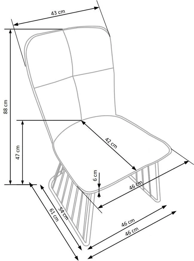 - Wymiary: szerokość mebla: 46 cm, szerokość siedziska: 46 cm, głębokość mebla: 61 cm, głębokość siedziska: 42 cm, wysokość siedziska: 47 cm, wysokość całkowita: 88 cm.