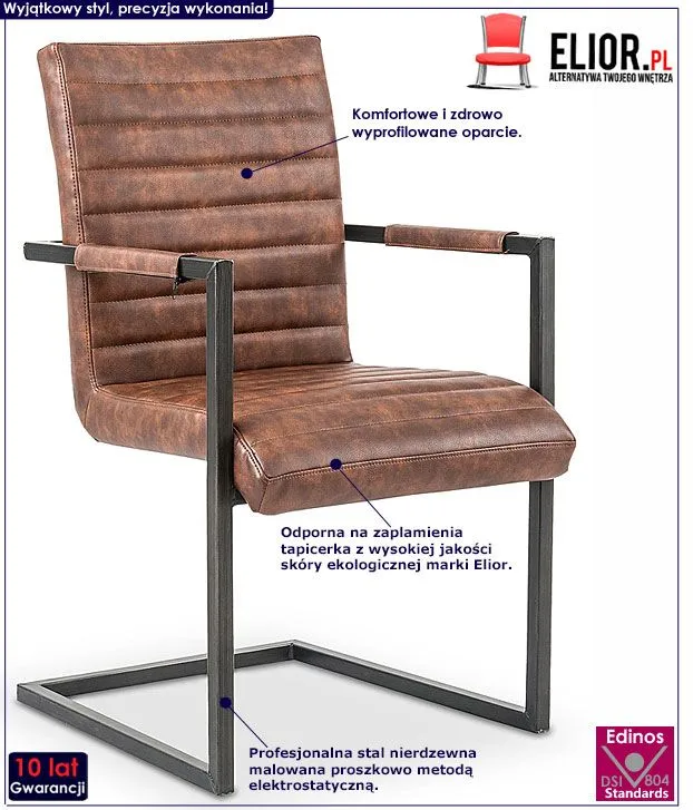 Oryginalne zaprojektowane krzesło Belix wyróżnia się nie tylko swoją unikalną formą, ale także zastosowaniem materiałów najlepszej jakości. Designerska tapicerka w kolorze brązowym pokryta została najwyższej jakości ekoskórą (skórą ekologiczną), łatwą do utrzymania w czystości (co jest szczególnie istotne w przypadku produktów wykorzystywanych podczas spożywania posiłków). Ekoskóra używana przy produkcji mebli marki Profeos jest o wiele bardziej odporna na słońce oraz substancje płynne , co pozwala Ci na długie i bezpieczne użytkowanie. Już nie musisz się martwić, że rozlana kawa spowoduje konieczność wymiany mebla. Skóra ekologiczna marki Profeos została pokryta warstwą polichlorku winylu. Czarny profil krzesła stworzony jest z najwyższej jakości nierdzewnej stali malowanej odpornym na zarysowania i zadrapania. Najwyższa jakość techniki polimeryzacji pozwoliła zaoferować firmie Elior aż 10 lat gwarancji na swoje produkty. Już nie musisz się martwić, że po kilku latach część farby odpryśnie od mebla . Najmodniejsza kolorystyka i wyjątkowa, współczesna forma sprawiają, że krzesło doskonale odnajduje się we wnętrzach mieszkalnych i komercyjnych urządzonych zarówno w stylu nowoczesnym, jak też loftowym, industrialnym czy minimalistycznym. Dzięki komfortowym podłokietnikom świetnie sprawdza się także jako wygodny fotel do biurka. Krzesło marki Elior zapewnia Ci niezapomniane chwile przy stole w gronie przyjaciół i rodziny. Sprawdź, jak niesamowicie mebel prezentuje się na żywo!