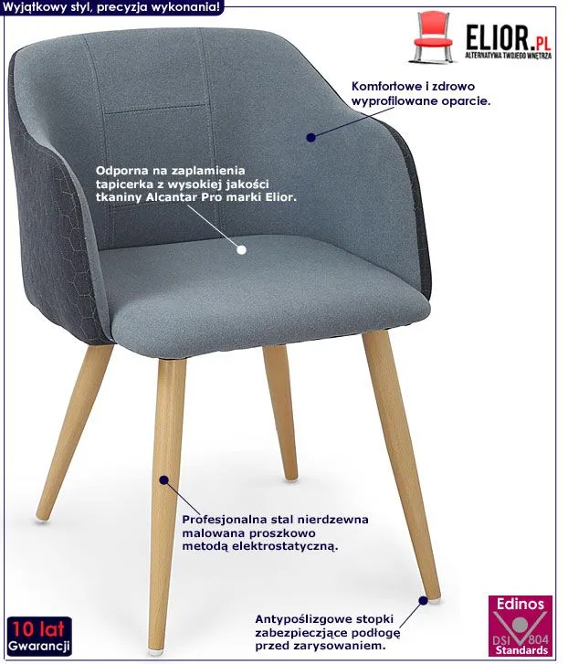 Oryginalne zaprojektowane krzesło Mervex wyróżnia się nie tylko swoją unikalną formą, ale także zastosowaniem materiałów najlepszej jakości. Designerska tapicerka w kolorze niebieskim wykonana została z wysokiej jakości tkaniny Alcantar Pro, charakteryzującej się dużą odpornością na ścieranie i zabrudzenie oraz niezwykłą miękkością w dotyku (dzięki warstwie poliuretanu). Tkanina Alcantar Pro, która jako jedyna na rynku produkowana jest z dokładnie wyselekcjonowanych ultramikrowłókien o objętości aż do 24-razy drobniejszej od ludzkiego włosa,charakteryzuje się wyjątkową żywotnością, odpornością oraz niezwykłą łatwością w utrzymaniu. Posiada ponadprzeciętne cechy wytrzymałościowe, dzięki czemu unikniesz co sezonowej wymiany tapicerki. Tkanina Alcantar jest także bardzo praktyczna i można ją czyścić na mokro, co jest szczególnie istotne w przypadku mebli wykorzystywanych podczas posiłków. Tylna strona krzesła w kolorze granatowym została efektownie ozdobiona delikatnym printem. Profil mebla stworzony jest z najwyższej jakości nierdzewnej stali malowanej odpornym na zarysowania i zadrapania. Najwyższa jakość techniki polimeryzacji pozwoliła zaoferować firmie Elior aż 10 lat gwarancji na swoje produkty. Już nie musisz się martwić, że po kilku latach część farby odpryśnie od mebla . Stonowana kolorystyka i prosta, współczesna forma sprawiają, że krzesło doskonale odnajduje się we wnętrzach mieszkalnych czy komercyjnych urządzonych w stylu skandynawskim, jak też minimalistycznym czy nowoczesnym. Świetnie sprawdza się także jako komfortowy fotel do biurka. Krzesło marki Elior zapewnia Ci niezapomniane chwile przy stole w gronie przyjaciół i rodziny. Sprawdź, jak niesamowicie mebel prezentuje się ten mebel na żywo!
