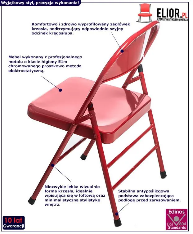- Produkt posiada certyfikat jakości "Edinos Standards DSI 804", który potwierdza najwyższą jakość wykonania mebla oraz pełny stopień zgodności poszczególnych jednostek wytworzonego wyrobu z przyjętym wzorcem.