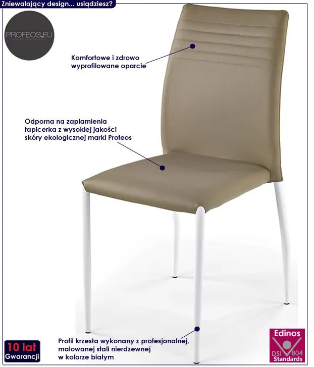 Oryginalne i komfortowe krzesło Avla wyróżnia się nie tylko swoją unikalną formą, ale także zastosowaniem materiałów najlepszej jakości. Designerska tapicerka w kolorze ciemnobeżowym wykonana została z najwyższej jakości ekoskóry (skóry ekologicznej), łatwej do utrzymania w czystości. Ekoskóra używana przy produkcji mebli marki Profeos jest o wiele bardziej odporna na słońce oraz wodę , co pozwala Ci na długie i bezpieczne użytkowanie. Już nie musisz się martwić, że rozlana kawa spowoduje konieczność wymiany mebla. Skóra ekologiczna marki Profeos została pokryta warstwą polichlorku winylu. Profil krzesła w kolorze białym stworzony jest z najwyższej jakości nierdzewnej stali malowanej proszkowo odpornym na zarysowania i zadrapania. Najwyższa jakość techniki polimeryzacji pozwoliła zaoferować firmie Profeos aż 10 lat gwarancji na swoje produkty. Już nie musisz się martwić, że po kilku latach część farby odpryśnie od mebla . Stonowana kolorystyka sprawia, że nowe krzesło Avla świetnie odnajdzie się w przestrzeni mieszkalnej czy biurowej. Pozwól by odmieniło także Twoje wnętrze...