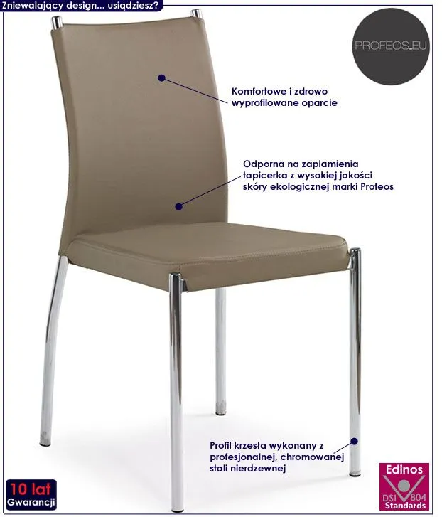 Komfortowe krzesło Moa wyróżnia się nie tylko swoją unikalną formą, ale także zastosowaniem materiałów najlepszej jakości. Tapicerka mebla w kolorze ciemnobeżowym pokryta została najwyższej jakości ekoskórą (skórą ekologiczną), łatwą do utrzymania w czystości. Ekoskóra używana przy produkcji mebli marki Profeos jest o wiele bardziej odporna na słońce oraz wodę , co pozwala Ci na długie i bezpieczne użytkowanie. Już nie musisz się martwić, że rozlana kawa spowoduje konieczność wymiany mebla. Skóra ekologiczna marki Profeos została pokryta warstwą polichlorku winylu, dzięki czemu jest także odporna na działanie środków dezynfekujących na bazie rozpuszczalników - chemikalia te niszczą skórę naturalną. Profil krzesła stworzony jest z najwyższej jakości chromowanej stali o zawartości aż stali nierdzewnej oraz chromu, co gwarantuje mu niezwykły efekt wizualny, posiadając przy tym ponadprzeciętne cechy antykorozyjne oraz lepszą odporność na uszkodzenia mechaniczne . Stonowana kolorystyka sprawia, że nowe krzesło Moa świetnie odnajdzie się w przestrzeni mieszkalnej czy biurowej. Pozwól, by odmieniło także Twoje wnętrze...