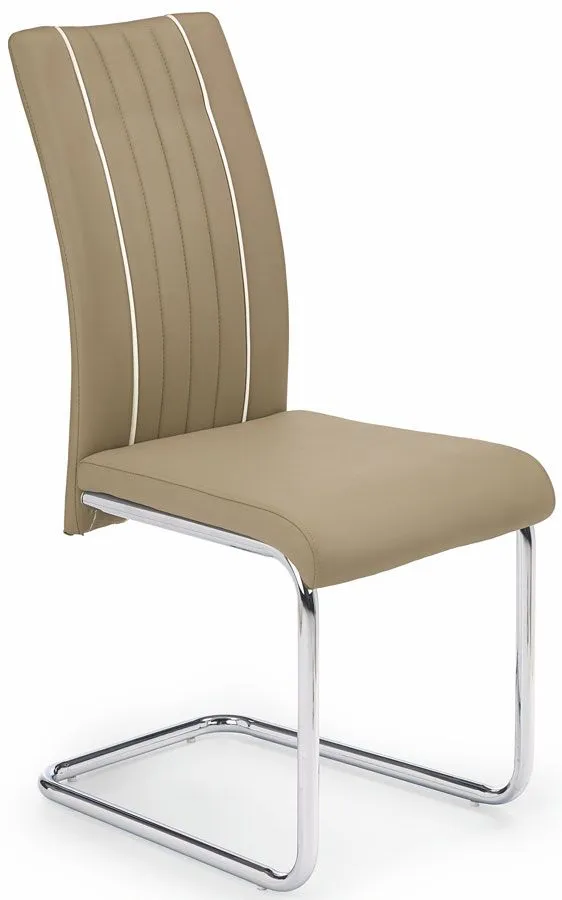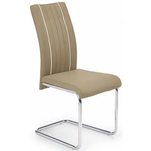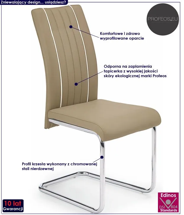Komfortowe krzesło Berto wyróżnia się nie tylko swoją unikalną formą, ale także zastosowaniem materiałów najlepszej jakości. Pikowana tapicerka mebla w kolorze beżowym pokryta została najwyższej jakości ekoskórą (skórą ekologiczną), łatwą do utrzymania w czystości. Ekoskóra używana przy produkcji mebli marki Profeos jest o wiele bardziej  odporna na słońce oraz wodę , co pozwala Ci na długie i bezpieczne użytkowanie. Już nie musisz się martwić, że rozlana kawa spowoduje konieczność wymiany mebla. Skóra ekologiczna marki Profeos została pokryta warstwą polichlorku winylu. Profil krzesła stworzony jest z najwyższej jakości chromowanej stali o zawartości aż stali nierdzewnej oraz chromu, co gwarantuje mu niezwykły efekt wizualny, posiadając przy tym ponadprzeciętne cechy antykorozyjne oraz lepszą odporność na uszkodzenia mechaniczne . Stonowana kolorystyka sprawia, że nowe krzesło Berto świetnie odnajdzie się w przestrzeni mieszkalnej czy biurowej. Podaruj swojemu wnętrzu nastrojowego klimatu, harmonizując go z ciepłem naturalnych barw...