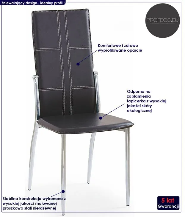 Wykwintne i komfortowe krzesło Olox wyróżnia się nie tylko swoją unikalną formą, ale także zastosowaniem materiałów najlepszej jakości. To dlatego cieszy się ono powodzeniem wśród osób lubiących ciekawe rozwiązania i szybko zyskało status bestsellera. Designerska tapicerka krzesła wykonana została z najwyższej jakości ekoskóry (skóry ekologicznej), łatwej do utrzymania w czystości. Ekoskóra używana przy produkcji mebli marki Profeos jest o wiele bardziej odporna na słońce oraz wodę , co pozwala Ci na długie i bezpieczne użytkowanie. Już nie musisz się martwić, że rozlana kawa spowoduje konieczność wymiany mebla. Skóra ekologiczna marki Profeos została pokryta warstwą polichlorku winylu. Profil krzesła stworzony jest z najwyższej jakości chromowanej stali o zawartości aż stali nierdzewnej oraz chromu, co gwarantuje mu niezwykły efekt wizualny, posiadając przy tym ponadprzeciętne cechy antykorozyjne oraz lepszą odporność na uszkodzenia mechaniczne . Nowe krzesło Olox świetnie nadaje się do salonu, kuchni, pracowni czy jadalni. Pozwól by odmieniło także Twoje wnętrze!