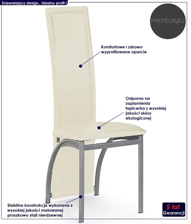 Eleganckie i komfortowe krzesło Owen wyróżnia się nie tylko swoją unikalną formą, ale także zastosowaniem materiałów najlepszej jakości. Designerska tapicerka krzesła wykonana została z najwyższej jakości ekoskóry (skóry ekologicznej), łatwej do utrzymania w czystości. Ekoskóra używana przy produkcji mebli marki Profeos jest o wiele bardziej odporna na słońce oraz wodę , co pozwala Ci na długie i bezpieczne użytkowanie. Już nie musisz się martwić, że rozlana kawa spowoduje konieczność wymiany mebla. Skóra ekologiczna marki Profeos została pokryta warstwą polichlorku winylu. Profil krzesła stworzony jest z najwyższej jakości nierdzewnej stali malowanej proszkowo, co gwarantuje mu niezwykły efekt wizualny, posiadając przy tym ponadprzeciętne cechy antykorozyjne oraz lepszą odporność na uszkodzenia mechaniczne . Mebel dostępny jest w klasycznych i eleganckich kolorach: beżowym oraz czarnym, co gwarantuje jego uniwersalność i pozwala Ci dopasować go dokładnie do Twojego wnętrza. Nowe krzesło Owen świetnie nadaje się do salonu, kuchni, pracowni czy jadalni. Z powodzeniem sprawdzi się też jako wygodny fotel do biurka. Pozwól by było ozdobą także Twoich czterech kątów...
