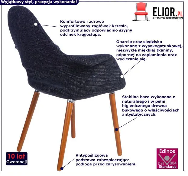 Modernistyczne i komfortowe krzesło jest meblem cechującym się modną, niezwykle interesującą stylistyką. Jest to zasługa między innymi starannie dobranych i niezwykle trwałych materiałów meblarskich. Dzięki nim krzesło użytkuje się naprawdę wygodnie, przyjemnie i co istotne – bez uszkodzeń przez wiele lat. Do produkcji krzesła wykorzystano poddane specjalistycznej obróbce, nowoczesne surowice. Siedzisko zostało wykonane z wysokogatunkowej, „oddychającej” i miękkiej tkaniny o szlachetnych ultramikrowłóknach, odpornej na zaplamienia i ścieranie się. Podstawa to z kolei naturalne, profesjonalne, higieniczne i jakże przepiękne drewno bukowe o właściwościach antystatycznych. Te innowacyjne surowce zapewniają wyjątkową trwałość i odporność na uszkodzenia krzesła. To niezwykle istotne, by meble, w które inwestujemy cechowało wytrzymałe, staranne wykonanie. Na szczęście z fantastycznym krzesłem Pristo nie trzeba się o to martwić! Modny i pełen modernistycznego charakteru mebel wciąż cieszy oko ciekawym wdziękiem. Pristo posiada niebywałe zalety – trwałość, stabilność, dokładne wykonanie, funkcjonalizm i oczywiście świeżą, pełną klasy i pomysłowości prezencję. Chyba każdy przyzna, że warto mieć tak stylowy i funkcjonalny mebel w swoich starannie zaaranżowanych przestrzeniach.