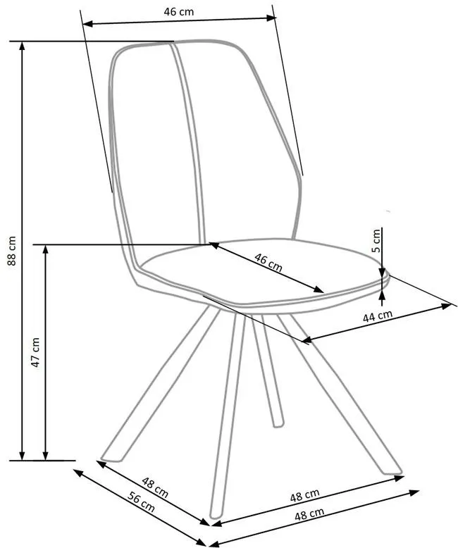 - Wymiary: wysokość całkowita – 88 cm, rozstaw nóżek – 48 cm, szerokość mebla - 48 cm, szerokość siedziska – 44 cm, głębokość mebla - 56 cm, głębokość siedziska – 46 cm, wysokość siedziska – 47 cm.