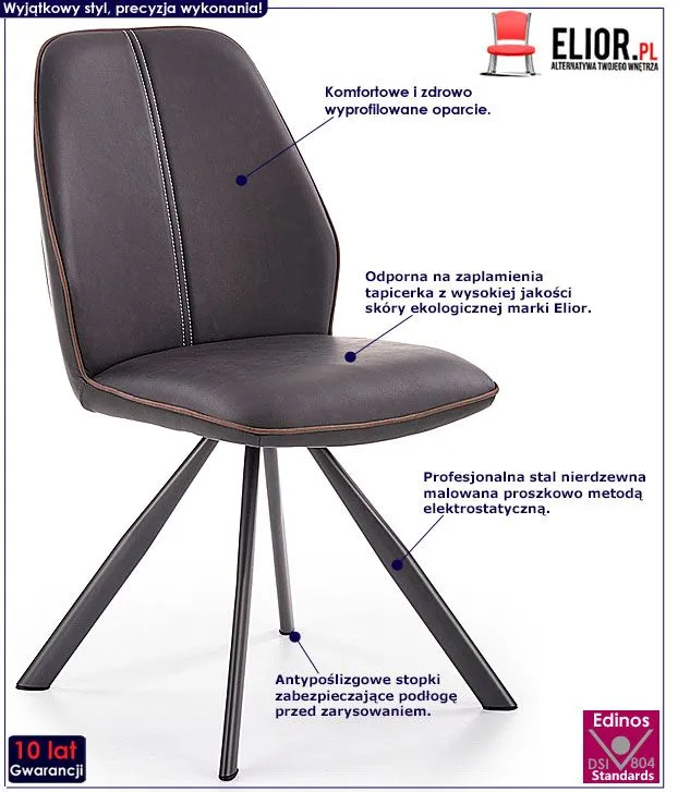 Obawy dotyczące jakości tapicerki są całkowicie zrozumiałe – jeśli kupiłeś kiedyś krzesło tapicerowane nikłej jakości, z pewnością masz złe doświadczenia. Z naszymi meblami nie będzie takich problemów. Krzesło Batio marki Elior zostało pokryte wysokojakościową ekoskórą, która wykazuje wyjątkową odporność na uszkodzenia mechaniczne i działanie promieni słonecznych. Dzięki temu zyskujesz pewność, że krzesło pozostanie w pierwotnym stanie wizualnym przez wiele lat, jego kolor nie wyblaknie i będzie prezentować się nienagannie. Ekologiczna skóra pokryta jest polichlorkiem winylu, co maksymalizuje jej odporność na działanie silnych środków czyszczących. Nie musisz więc obawiać się rozlanej herbaty czy kawy, a także plam po obiedzie – wiadomo, że w jadalni może zdarzyć się wszystko, zwłaszcza kiedy ma się dzieci. Tapicerka z ekoskóry wytrzyma najtrudniejsze warunki!