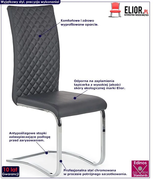 Niebanalnie zaprojektowane krzesło Revad wyróżnia się nie tylko swoją unikalną formą, ale także zastosowaniem materiałów najlepszej jakości. Pikowana tapicerka krzesła w kolorze czarnym pokryta została najwyższej jakości ekoskórą (skórą ekologiczną), łatwą do utrzymania w czystości (co jest szczególnie istotne w przypadku produktów wykorzystywanych podczas spożywania posiłków). Ekoskóra używana przy produkcji mebli marki Elior jest o wiele bardziej odporna na słońce oraz substancje płynne , co pozwala Ci na długie i bezpieczne użytkowanie. Rozlana kawa nie spowoduje już więcej konieczności wymiany tapicerki. Skóra ekologiczna została pokryta warstwą polichlorku winylu. Profil krzesła stworzony jest z najwyższej jakości chromowanej stali o zawartości aż stali nierdzewnej oraz chromu, co gwarantuje mu niezwykły efekt wizualny, posiadając przy tym ponadprzeciętne cechy antykorozyjne oraz lepszą odporność na uszkodzenia mechaniczne . Najmodniejsza kolorystyka oraz wyjątkowa, współczesna forma sprawiają, że krzesło Revad doskonale odnajduje się we wnętrzach mieszkalnych i komercyjnych urządzonych zarówno w stylu nowoczesnym, jak też loftowym, industrialnym czy minimalistycznym. Krzesło marki Elior zapewnia Ci niezapomniane chwile w czasie spotkań w gronie przyjaciół i rodziny. Sprawdź już teraz, jak niesamowicie mebel prezentuje się na żywo!