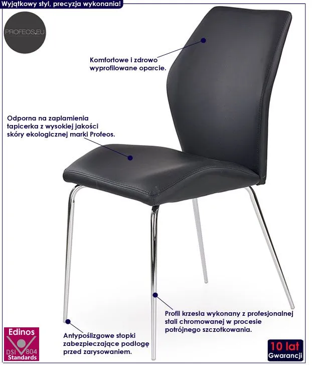 Komfortowe krzesło Vonid wyróżnia się nie tylko swoją unikalną formą, ale także zastosowaniem materiałów najlepszej jakości. Designerska tapicerka mebla w kolorze czarnym pokryta została najwyższej jakości ekoskórą (skórą ekologiczną), łatwą do utrzymania w czystości (co jest szczególnie istotne w przypadku produktów wykorzystywanych podczas spożywania posiłków). Ekoskóra używana przy produkcji mebli marki Profeos jest o wiele bardziej odporna na słońce oraz substancje płynne , co pozwala Ci na długie i bezpieczne użytkowanie. Już nie musisz się martwić, że rozlana kawa spowoduje konieczność wymiany mebla. Skóra ekologiczna marki Profeos została pokryta warstwą polichlorku winylu. Profil krzesła stworzony jest z najwyższej jakości stali chromowanej o zawartości aż stali nierdzewnej oraz chromu, co gwarantuje mu niezwykły efekt wizualny, posiadając przy tym ponadprzeciętne cechy antykorozyjne oraz lepszą odporność na uszkodzenia mechaniczne . Stonowana, minimalistyczna kolorystyka sprawia, że nowe krzesło Vonid świetnie odnajduje się w przestrzeni mieszkalnej, restauracyjnej czy biurowej. Wnieś do swego wnętrza nastrojowy klimat, harmonizując go z tajemniczością klasycznej czerni!