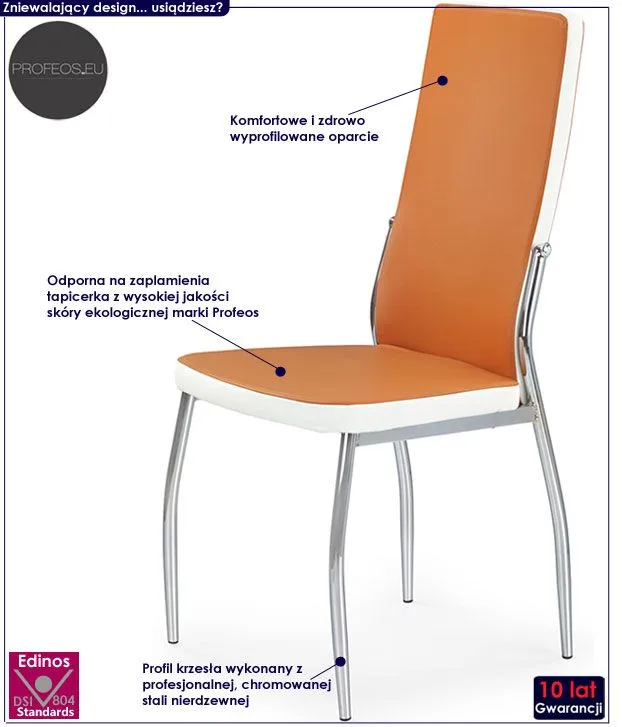 Oryginalne i komfortowe krzesło Archan wyróżnia się nie tylko swoją unikalną formą, ale także zastosowaniem materiałów najlepszej jakości. Designerska tapicerka w kolorze zielonym z białymi wstawkami wykonana została z najwyższej jakości ekoskóry (skóry ekologicznej), łatwej do utrzymania w czystości. Ekoskóra używana przy produkcji mebli marki Profeos jest o wiele bardziej odporna na słońce oraz substancje płynne , co pozwala Ci na długie i bezpieczne użytkowanie. Już nie musisz się martwić, że rozlana kawa spowoduje konieczność wymiany mebla. Skóra ekologiczna marki Profeos została pokryta warstwą polichlorku winylu. Profil krzesła stworzony jest z najwyższej jakości chromowanej stali o zawartości aż stali nierdzewnej oraz chromu, co gwarantuje mu niezwykły efekt wizualny, posiadając przy tym ponadprzeciętne cechy antykorozyjne oraz lepszą odporność na uszkodzenia mechaniczne . Krzesło Archan zapewnia Ci niezapomniane chwile przy stole w gronie przyjaciół i rodziny. Pozwól by odmieniło także Twoje wnętrze...