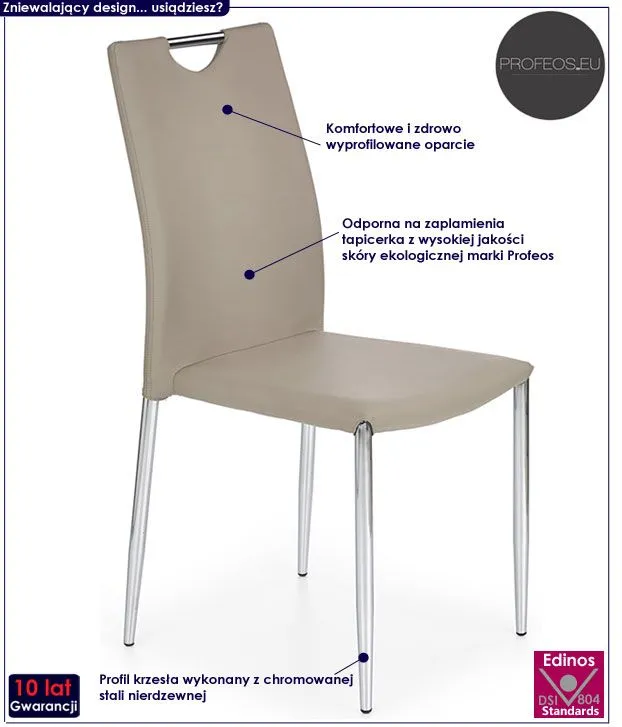 Oryginalne i komfortowe krzesło Kubbo wyróżnia się nie tylko swoją unikalną formą, ale także zastosowaniem materiałów najlepszej jakości. Designerska tapicerka w kolorze cappuccino wykonana została z najwyższej jakości ekoskóry (skóry ekologicznej), łatwej do utrzymania w czystości. Ekoskóra używana przy produkcji mebli marki Profeos jest o wiele bardziej odporna na słońce oraz wodę , co pozwala Ci na długie i bezpieczne użytkowanie. Już nie musisz się martwić, że rozlana kawa spowoduje konieczność wymiany mebla. Skóra ekologiczna marki Profeos została pokryta warstwą polichlorku winylu. Profil krzesła stworzony jest z najwyższej jakości chromowanej stali o zawartości aż stali nierdzewnej oraz chromu, co gwarantuje mu niezwykły efekt wizualny, posiadając przy tym ponadprzeciętne cechy antykorozyjne oraz lepszą odporność na uszkodzenia mechaniczne . Stonowana kolorystyka sprawia, że nowe krzesło Kubbo świetnie odnajdzie się w przestrzeni mieszkalnej, restauracyjnej czy biurowej. Pozwól by odmieniło także Twoje wnętrze...