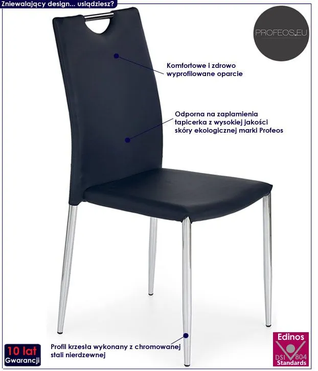 Oryginalne i komfortowe krzesło Kubbo wyróżnia się nie tylko swoją unikalną formą, ale także zastosowaniem materiałów najlepszej jakości. Designerska tapicerka w kolorze czarnym wykonana została z najwyższej jakości ekoskóry (skóry ekologicznej), łatwej do utrzymania w czystości. Ekoskóra używana przy produkcji mebli marki Profeos jest o wiele bardziej odporna na słońce oraz wodę , co pozwala Ci na długie i bezpieczne użytkowanie. Już nie musisz się martwić, że rozlana kawa spowoduje konieczność wymiany mebla. Skóra ekologiczna marki Profeos została pokryta warstwą polichlorku winylu. Profil krzesła stworzony jest z najwyższej jakości chromowanej stali o zawartości aż stali nierdzewnej oraz chromu, co gwarantuje mu niezwykły efekt wizualny, posiadając przy tym ponadprzeciętne cechy antykorozyjne oraz lepszą odporność na uszkodzenia mechaniczne . Stonowana kolorystyka sprawia, że nowe krzesło Kubbo świetnie odnajdzie się w przestrzeni mieszkalnej, restauracyjnej czy biurowej. Pozwól by odmieniło także Twoje wnętrze...