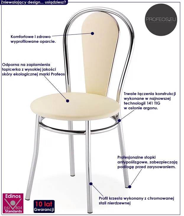 Oryginalne i komfortowe krzesło Luto wyróżnia się nie tylko swoją unikalną formą, ale także zastosowaniem materiałów najlepszej jakości. Designerska tapicerka w kolorze brąz wykonana została z najwyższej jakości ekoskóry (skóry ekologicznej), łatwej do utrzymania w czystości. Ekoskóra używana przy produkcji mebli marki Profeos jest o wiele bardziej odporna na słońce oraz substancje płynne , co pozwala Ci na długie i bezpieczne użytkowanie. Już nie musisz się martwić, że rozlana kawa spowoduje konieczność wymiany mebla. Skóra ekologiczna marki Profeos została pokryta warstwą polichlorku winylu. Profil krzesła stworzony jest z najwyższej jakości chromowanej stali o zawartości aż stali nierdzewnej oraz chromu, co gwarantuje mu niezwykły efekt wizualny, posiadając przy tym ponadprzeciętne cechy antykorozyjne oraz lepszą odporność na uszkodzenia mechaniczne . Mebel dostępny jest w trzech modnych kolorach: brązowym, beżowym oraz kremowym. Wnieś do swojego domu nastrojowy klimat, dzięki krzesłom Luto marki Profeos.