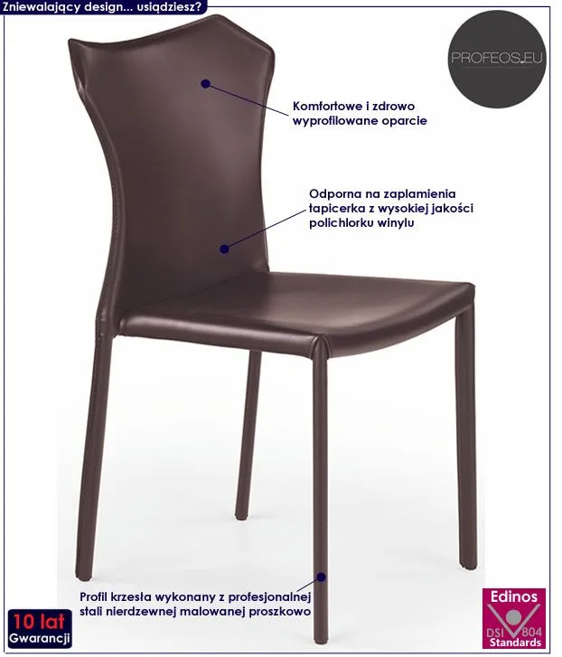 Niebanalne i komfortowe krzesło Emprix wyróżnia się nie tylko swoją unikalną formą, ale także zastosowaniem materiałów najlepszej jakości. Designerska tapicerka w kolorze brązowym pokryta została wysokiej jakości tworzywem z polichlorku winylu, co gwarantuje Ci komfort użytkowania. Materiał ten charakteryzuje się ponadprzeciętną wytrzymałością mechaniczną, jest również odporny na działanie rozpuszczalników (co jest szczególnie ważne w przypadku mebli wykorzystywanych podczas posiłków). Profil krzesła stworzony jest z najwyższej jakości nierdzewnej stali malowanej proszkowo odpornym na zarysowania i zadrapania. Najwyższa jakość techniki polimeryzacji pozwoliła zaoferować firmie Profeos aż 10 lat gwarancji na swoje produkty. Już nie musisz się martwić, że po kilku latach część farby odpryśnie od mebla . Krzesło Emprix zapewnia Ci niezapomniane chwile przy stole w gronie przyjaciół i rodziny. Pozwól by odmieniło także Twoje wnętrze...