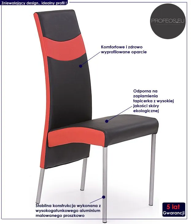 Wykwintne i komfortowe krzesło Tas wyróżnia się nie tylko swoją unikalną formą, ale także zastosowaniem materiałów najlepszej jakości. To dlatego cieszy się ono powodzeniem wśród osób lubiących ciekawe rozwiązania i szybko zyskało status bestsellera. Designerska dwukolorowa tapicerka krzesła wykonana została z najwyższej jakości najwyższej jakości ekoskóry (skóry ekologicznej), łatwej do utrzymania w czystości. Ekoskóra używana przy produkcji mebli marki Profeos jest o wiele bardziej odporna na słońce oraz wodę , co pozwala Ci na długie i bezpieczne użytkowanie. Już nie musisz się martwić, że rozlana kawa spowoduje konieczność wymiany mebla. Skóra ekologiczna marki Profeos została pokryta warstwą polichlorku winylu. Konstrukcję krzesła stworzono z najwyższej jakości aluminium malowanego proszkowo. Materiał ten charakteryzuje się lekkością i bardzo dużą wytrzymałością, co pozwala Ci na długie i bezpieczne użytkowanie krzesła. Mebel dostępny jest w klasycznych kolorach - biało-czarnym i czarno-czerwonym, bez problemu więc wybierzesz ten, który doskonale wpisze się w Twoje cztery kąty. Nowe krzesło Tas świetnie nadaje się do salonu, kuchni, pracowni czy jadalni. Pozwól by odmieniło także Twoje wnętrze...