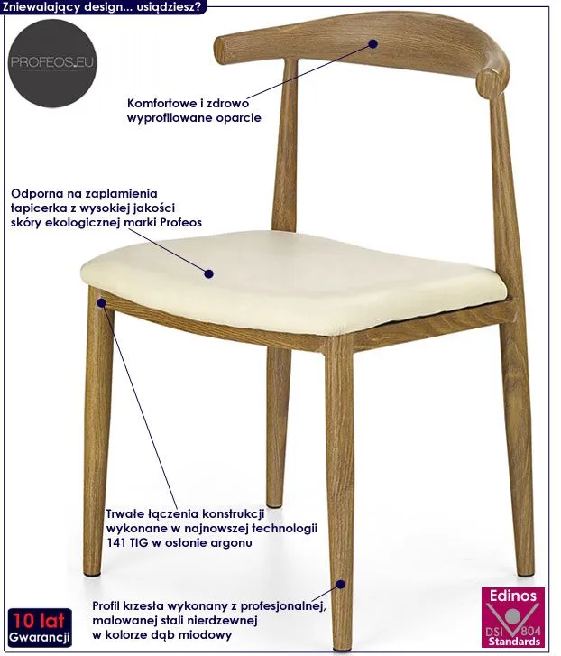 Oryginalne i komfortowe krzesło Igis wyróżnia się nie tylko swoją unikalną formą, ale także zastosowaniem materiałów najlepszej jakości. Designerska tapicerka w kolorze kremowym wykonana została z najwyższej jakości ekoskóry (skóry ekologicznej), łatwej do utrzymania w czystości. Ekoskóra używana przy produkcji mebli marki Profeos jest o wiele bardziej odporna na słońce oraz substancje płynne , co pozwala Ci na długie i bezpieczne użytkowanie. Już nie musisz się martwić, że rozlana kawa spowoduje konieczność wymiany mebla. Skóra ekologiczna marki Profeos została pokryta warstwą polichlorku winylu. Profil krzesła w kolorze dąb miodowy stworzony jest z najwyższej jakości nierdzewnej stali malowanej odpornym na zarysowania i zadrapania. Najwyższa jakość techniki polimeryzacji pozwoliła zaoferować firmie Profeos aż 10 lat gwarancji na swoje produkty. Już nie musisz się martwić, że po kilku latach część farby odpryśnie od mebla . Krzesło Igis zapewnia Ci niezapomniane chwile przy stole w gronie przyjaciół i rodziny. Pozwól by odmieniło również Twoje wnętrze!