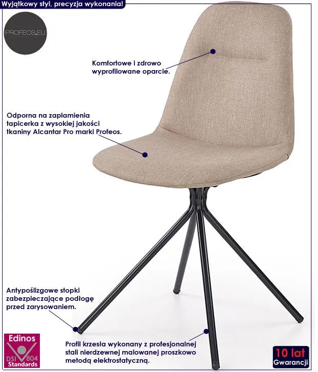 Oryginalne i komfortowe krzesło Fires wyróżnia się nie tylko swoją unikalną formą, ale także zastosowaniem materiałów najlepszej jakości. Designerska tapicerka w kolorze beżowym wykonana została z wysokiej jakości tkaniny Alcantar Pro, charakteryzującej się dużą odpornością na ścieranie i zabrudzenie oraz niezwykłą miękkością w dotyku (dzięki warstwie poliuretanu). Tkanina Alcantar Pro marki Profeos, która jako jedyna na rynku produkowana jest z dokładnie wyselekcjonowanych ultramikrowłókien o objętości aż do 24-razy drobniejszej od ludzkiego włosa, charakteryzuje się wyjątkową żywotnością, odpornością oraz niezwykłą łatwością w utrzymaniu. Posiada ponadprzeciętne cechy wytrzymałościowe, dzięki czemu unikniesz co sezonowej wymiany tapicerki. Tkanina Alcantar jest także bardzo praktyczna i można ją czyścić na mokro, co jest niezwykle istotne w przypadku mebli wykorzystywanych podczas posiłków. Profil krzesła w kolorze czarnym stworzony jest z najwyższej jakości nierdzewnej stali malowanej odpornym na zarysowania i zadrapania. Najwyższa jakość techniki polimeryzacji pozwoliła zaoferować firmie Profeos aż 10 lat gwarancji na swoje produkty. Już nie musisz się martwić, że po kilku latach część farby odpryśnie od mebla . Mebel dostępny jest w trzech modnych i efektownych wersjach kolorystycznych: popielatej, beżowej oraz turkusowej, dzięki czemu bez problemu wybierzesz ten, który najlepiej scharakteryzuje Twoje wnętrze. Krzesło Fires zapewnia Ci niezapomniane chwile przy stole w gronie przyjaciół i rodziny. Z powodzeniem sprawdza się również jako komfortowy fotel do biurka. Wnieś do swojego wnętrza nastrojowy klimat, harmonizując go z ciepłem naturalnych barw!