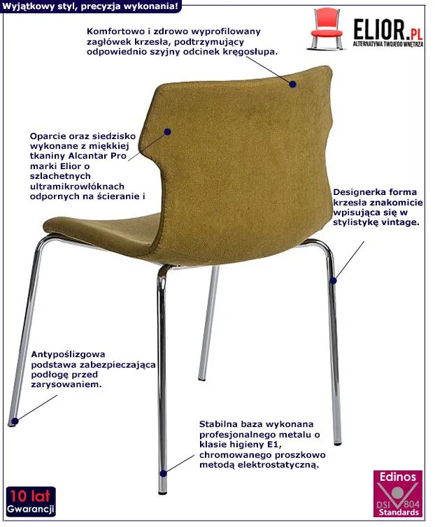 Urzekające stylistyką vintage, zielono – srebrne krzesło Zoruma 2X jest meblem cechującym się starannością wykonania. To zasługa między innymi profesjonalnie dobranych i niezwykle trwałych materiałów meblarskich. Dzięki nim krzesło użytkuje się naprawdę wygodnie, przyjemnie i co istotne – bez uszkodzeń przez wiele lat. Do produkcji pięknego krzesła Zoruma 2X wykorzystano dwa nowoczesne surowce. Siedzisko oraz oparcie Zoruma 2X zaprojektowano z wysokogatunkowej tkaniny Alcantar Pro, cechującej się odpornością na zaplamienia i ścieranie. Posiada ona szlachetne ultramikrowłókna, dodające obiciu miękkości oraz szyku. Modną tkaninę w przygaszonej zieleni osadzono na podstawie wykonanej z poddanego specjalistycznej obróbce metalu o klasie higieny E1 chromowanego proszkowo metodą elektrostatyczną, cechującego się odpornością na zarysowania i naprężenia mechaniczne. Ten trwały surowiec prezentuje się nad wyraz modernistycznie i świetnie wpisuje się w królujące obecnie na rynku aranżacyjne trendy. Oryginalne, pełne designerskiej pomysłowości i klasy krzesło Zoruma 2X odznacza się trwałością i stabilnością. To niezwykle istotne, by meble, w które inwestujemy cechowało wytrzymałe, staranne wykonanie. Na szczęście z rewelacyjnym krzesłem Zoruma 2X nie trzeba się o to martwić! Zachwycające i pełne wyrafinowania krzesło Zoruma 2X wciąż cieszy oko niebywałym szykiem. Krzesło posiada niezaprzeczalne zalety – trwałość, stabilność, dokładne wykonanie, funkcjonalizm i oczywiście niespotykaną, gustowną prezencję. Chyba każdy przyzna, że warto mieć tak stylowy i funkcjonalny mebel u siebie.
