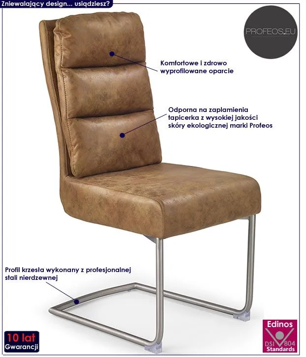 Komfortowe krzesło Eliot wyróżnia się nie tylko swoją unikalną formą, ale także zastosowaniem materiałów najlepszej jakości. Designerska tapicerka krzesła w kolorze brązowym pokryta została najwyższej jakości ekoskórą (skórą ekologiczną), łatwą do utrzymania w czystości. Ekoskóra używana przy produkcji mebli marki Profeos jest o wiele bardziej odporna na słońce oraz substancje płynne , co pozwala Ci na długie i bezpieczne użytkowanie. Już nie musisz się martwić, że rozlana kawa spowoduje konieczność wymiany mebla. Skóra ekologiczna marki Profeos została pokryta warstwą polichlorku winylu. Profil krzesła stworzony jest z najwyższej jakości nierdzewnej stali, co gwarantuje mu niezwykły efekt wizualny, posiadając przy tym ponadprzeciętne cechy antykorozyjne. Stonowana kolorystyka sprawia, że nowe krzesło Eliot świetnie odnajdzie się w przestrzeni mieszkalnej czy biurowej. Z powodzeniem posłuży Ci również jako wygodny fotel do biurka. Pozwól by odmieniło także Twoje wnętrze...