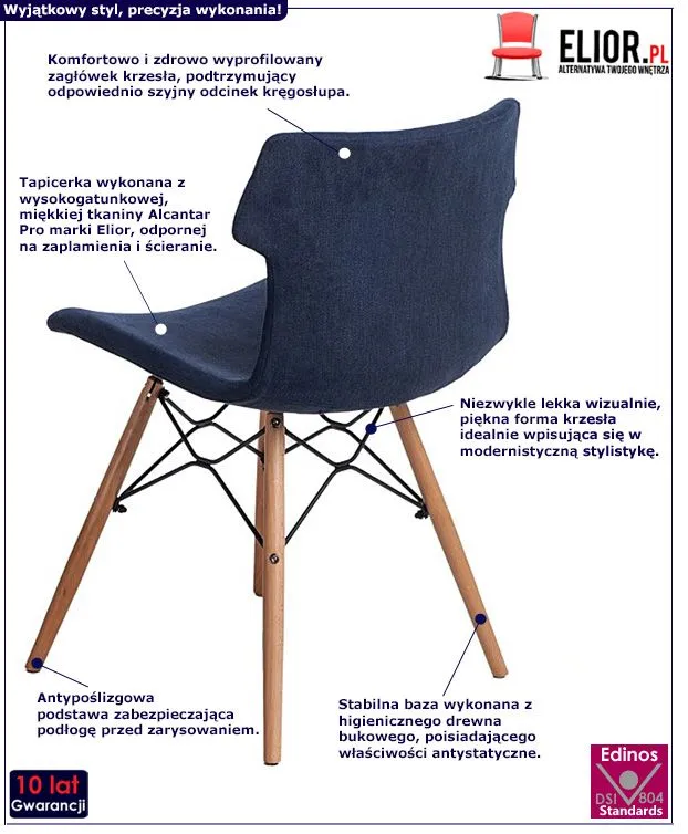 Modernistyczne krzesło Limora jest meblem cechującym się starannością wykonania. Jest to zasługa między innymi profesjonalnie dobranych i niezwykle trwałych materiałów meblarskich. Dzięki nim krzesło użytkuje się naprawdę wygodnie, przyjemnie i co istotne – bez uszkodzeń przez wiele lat. Do produkcji fantastycznego Limoraa wykorzystano dwa nowoczesne surowce. Siedzisko oraz oparcie Limoraa zaprojektowano z wysokogatunkowej, miękkiej tkaniny Alcantar Pro mari Elior, cechującej się odpornością na zaplamienia i ścieranie. Modną tkaninę w niebieskim odcieniu osadzono na podstawie wykonanej z poddanego specjalistycznej obróbce, naturalnego drewna bukowego. Posiada ono właściwości antystatyczne, a dzięki temu kurz nie osiada na nim łatwo. Ponadto drewno prezentuje się nad wyraz modernistycznie i świetnie wpisuje się w królujące obecnie na rynku aranżacyjne trendy. Nowoczesny, pełen designerskiej pomysłowości i klasy Limora odznacza się trwałością i stabilnością. To niezwykle istotne, by meble, w które inwestujemy cechowało wytrzymałe, staranne wykonanie. Na szczęście ze znakomitym krzesłem Limora nie trzeba się o to martwić! Modernistyczne i pełne naturalnego wdzięku krzesło Limora wciąż cieszy oko niebywałym szykiem. Krzesło posiada rewelacyjne zalety – trwałość, stabilność, dokładne wykonanie, funkcjonalizm i oczywiście świeżą, jakże aktualną prezencję. Chyba każdy przyzna, że warto mieć tak stylowy i funkcjonalny mebel u siebie.
