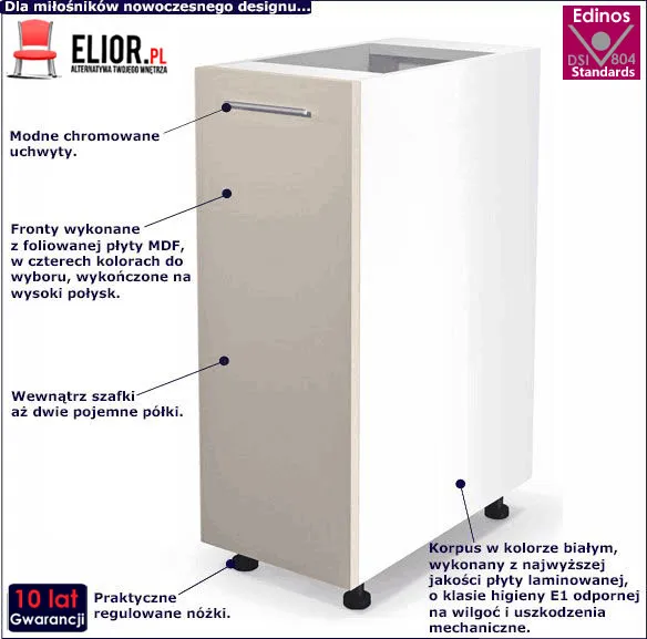 - Kolor: Front w kolorze jasny beż połysk, biały korpus. Uchwyty metalowe - chromowane. Kliknij i sprawdź także inne szafki kuchenne w sklepie Edinos.pl. Stwórz swój praktyczny zestaw mebli.