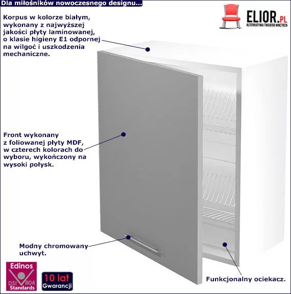- Kolor: Front w kolorze jasny popiel połysk, biały korpus. Uchwyty metalowe - chromowane. Kliknij i sprawdź także inne szafki kuchenne w sklepie Edinos.pl. Stwórz swój praktyczny zestaw mebli.